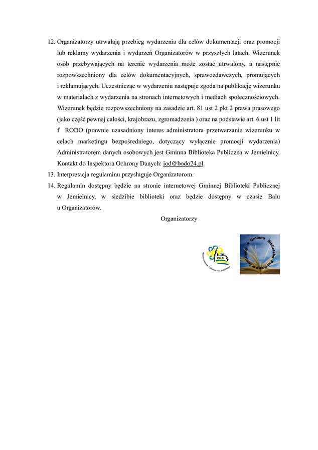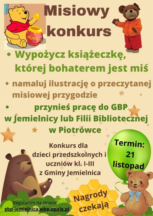 Wyrażam zgodę na wykorzystanie wizerunku mojego dziecka do celów promocyjnych w ramach konkursu  "Misiowy konkurs" zgodnie z art. 81 ust. 1 ustawy z dnia  4 lutego 1994 roku o prawie autorskim i prawach pokrewnych  (Dz. U. z 2021, poz. 1062). Wyrażenie zgody jest jednoznaczne z tym, iż fotografie, filmy lub nagrania wykonane podczas wydarzeń związanych z konkursem mogą zostać umieszczone na stronach internetowych Gminnej Biblioteki Publicznej w Jemielnicy, portalach społecznościowych oraz wykorzystane w materiałach promocyjnych i publikacjach związanych z działalnością GBP w Jemielnicy. Zrzekam się niniejszym wszelkich roszczeń (istniejących i przyszłych), w tym również o wynagrodzenie względem wykorzystywania  wizerunku/głosu/wypowiedzi mojego dziecka  na potrzeby konkursu.